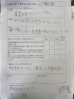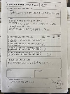 4時間目は、4月~7月の振り返りをしました。できるようになったことを「学習」「生活」「家」それぞれで考え、プリントに書きました。