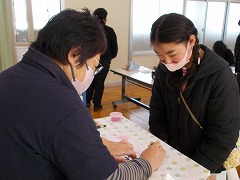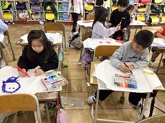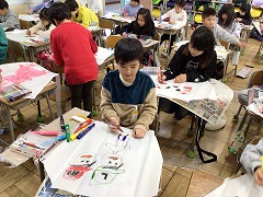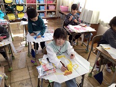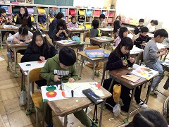 説明を聞いた後は、指で色を付けたり、筆ペンを使い己書を書いたりするため、何度も手洗いをして、講師の先生の手本に近づけていきます。