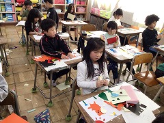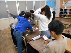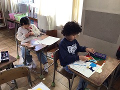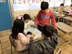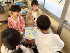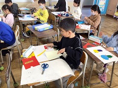 国語の授業では「音訓かるた」をつくりました。1つの漢字の音読みと訓読みを使って、読み札と取り札をつくりました。作った後は実際にかるたを行いました。
