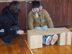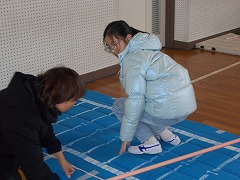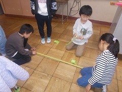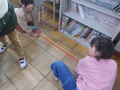 二人で支えてテープを持ったり、床の木目に合わせてものさしで長さをはかったりしていました。