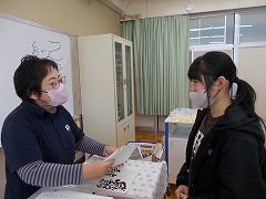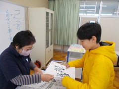 清書を書きあげ、講師の方に己書の印を押してもらいました。世界で1枚の己書が完成しました。全員が素晴らしいできで、講師の先生に一人一人褒めていただきました。