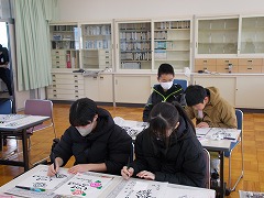 自分達が書いた下絵を基に、講師の先生が己書の字体に直してくださいました。
