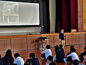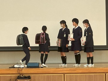 今朝の朝礼は、盛りだくさんでした。図書委員が図書室で秋に関する本の特集を始めたことの告知と、児童会運営委員からのあいさつ運動と赤い羽根共同募金の告知。