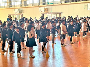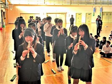 今月の歌は「心から心へ(『魔法をすてたマジョリン』より)」(作詞/梶賀千鶴子 作曲/鈴木邦彦)です。今回は6年生がリコーダーでハーモニーを付けました。全校でのびやかに歌いました。