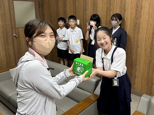 昼休みには、児童会役員が、皆さんから預かっていた「緑の募金」を愛西市の産業振興課の方に託しました。