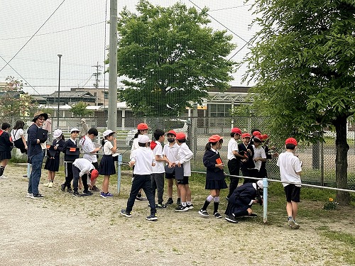 5年生が運動場で、雲の動きを観察していました。一面の曇り空でしたが、じっくり観察していると、今の雲がどちらからどちらへ動いているかを見ることができました。そのあと、クリの木や、そこに集まるテントウムシやその卵を楽しそうに観察していました。