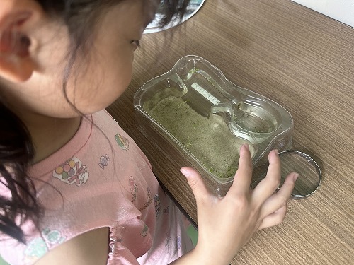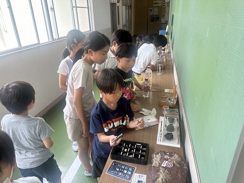 2時間目後の休み時間や昼休みは暑さ指数が31を超えたため、運動場での運動はさせないことにしました。その分、職員室前の「科学博物館」にはいつもより子どもが集まり科学の不思議や、新しく入った「カブトエビ」に親しんでいました。
