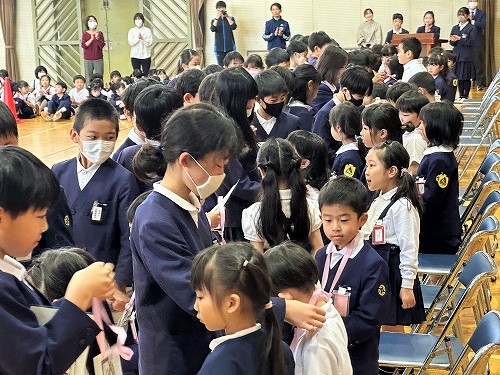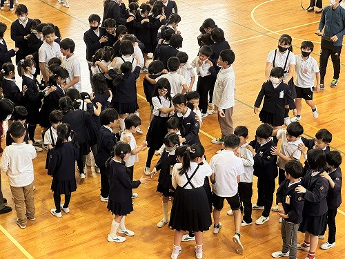 児童会代表からは「わからないことがあったら、いつでもきいてください。いろいろながくねんとこうりゅうしましょう。」とのメッセージがありました。最後は6年生と手をつないで会場を後にしました。
