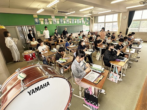 写真は6年生が地元の大型小売店のテーマソングをリコーダーで演奏する準備をしているところです。地域密着型の題材で子どもたちも大好きです。