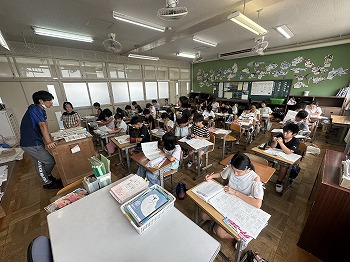 各教室では、子どもたちが夏休みの宿題を提出したり、答えの点検をしたりしています。