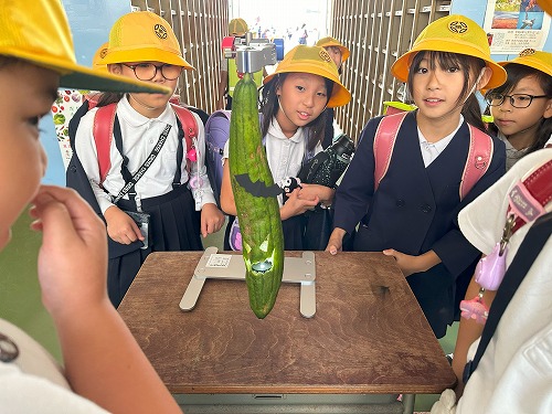 下校時に昇降口に展示すると、子どもたちが珍しそうに好奇心いっぱいに眺めていました。ヘチマを知らない低学年はしきりに「これなに?」と興味深く見ていました。