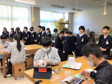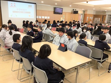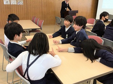 6年生が、4月からほとんどの子が通うことになる佐織中学校へ見学・交流会に行きました。校内を回って、「先輩たち」の授業の様子を見せてもらった後、ランチルームでテーブルごとに、中学1年生から中学校生活についての説明を聞いたり、質問を返したりしました。最後に、中学校で一緒になる、北河田小学校の6年生と、本校の「わくわくタイム」のように交流をしました。4月からの新しい仲間とも、親し気に話をすることができました。