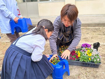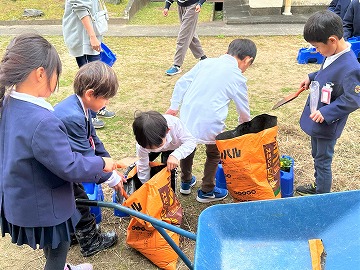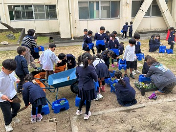 これから春になるまで大切に育てていきます。というのも、これらの鉢は来年度の1年生の入学式をお祝いする鉢花になるからです。新1年生の入学と、苗や球根の成長を、どちらも楽しみにしながら丁寧に植えていました。