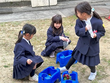1年生が、めいめいの植木鉢に、ビオラの苗とチューリップの球根を植えました。