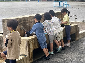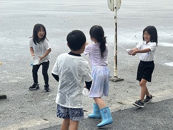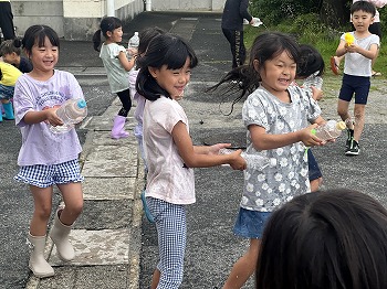 1年生が水遊びをしました。ペットボトルのキャップに穴をあけた水鉄砲で、互いに水をかけ合い大騒ぎ。