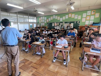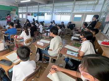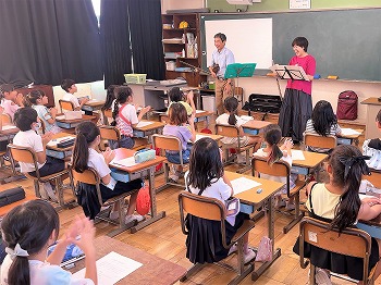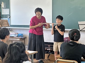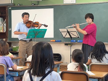 ヴァイオリンが得意な先生が、友人のフルート奏者を招いて、教室でミニ演奏会を開きました。6年生と3年生の授業で行いました。