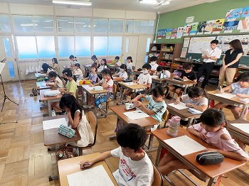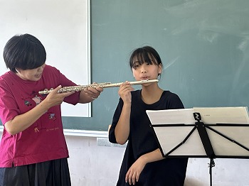 また、フルートに挑戦してみるコーナーや、旋律の印象からのクイズなどがあり、ワークシートに書き込みながら、子どもたちは興味をもって聞くことができました。