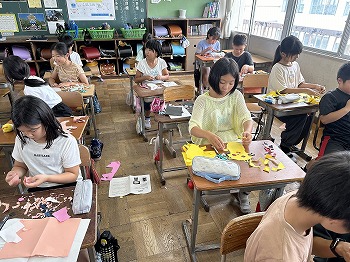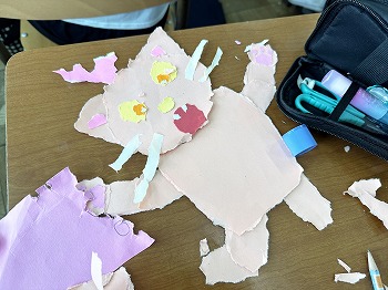 4年生が「どんぐりと山猫」を題材にした、ちぎり絵を作っていました。色画用紙を手でちぎって形を作っていくことで毛並みの雰囲気が出ています。子どもたちは、お話から感じた山猫のイメージをそれぞれに表していました。