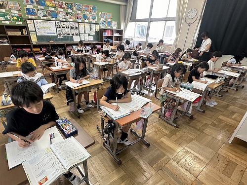 同じころ、3年生は算数の復習問題に取り組んでいました。冷房のために扉を閉めている教室に近づくと「無人か?」と思うほど静かに集中して取り組んでいました。
