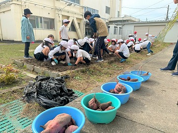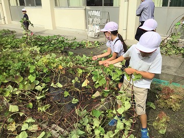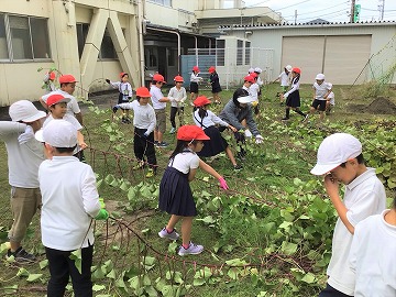 まずはつるを取り除きます。とても長く伸びたツルをみんなでひっぱって取り除きました。その後、そのツルからこのあとのクリスマス飾りのリースにするためにみんなで葉を落としました。それらを片付けたら、いよいよ芋ほりです。