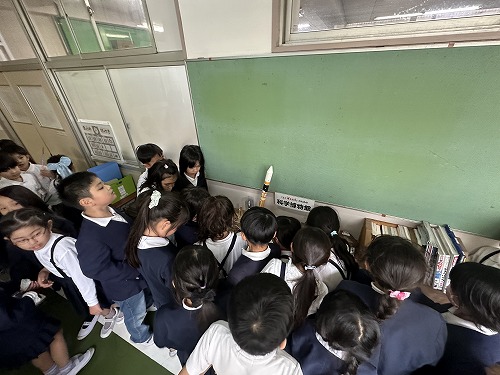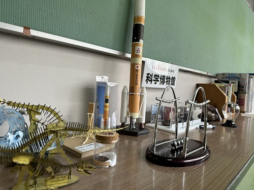 本校の目指す児童像の一つ「よく考える子」のために「科学博物館」を開きました。とはいっても職員室前の廊下に展示スパースを作ったものです。恐竜や化石、宇宙開発など、子どもたちが科学に興味を持ち、手に触れながら「なぜだろう、どういうしくみなのだろう」などと考えてくれることを願って展示しました。