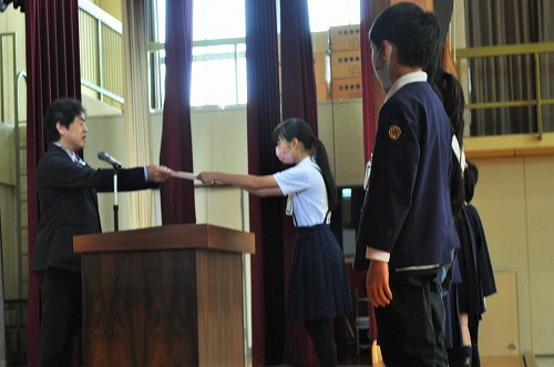学級委員、代議員、委員会委員長の前期役員の認証式を行いました。