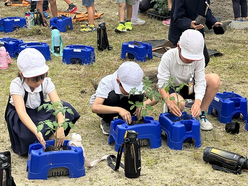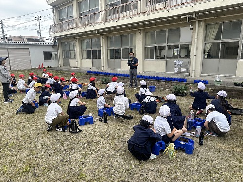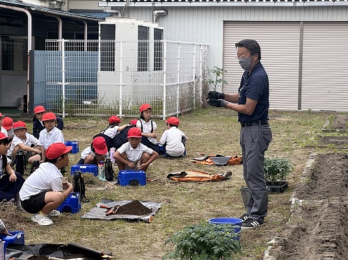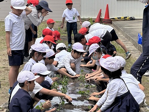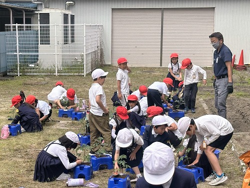 JAあいち海部の「やさい先生」をお招きしての出前授業を受けました。一人一人の鉢にはミニトマトの苗を。中庭の畑にはナス、オクラ、ピーマンとサツマイモの苗を植えました。どの子も楽しそうに取り組んでいました。明日からは畑の水などの管理を子どもたちが行っていきます。大きくおいしい野菜が育ち、どの子も進んで食べる野菜好きになってくれることを願っています。上手に育てていきましょうね。