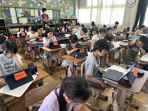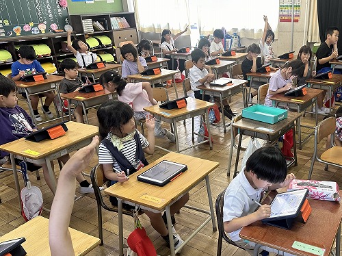 1年生は、国語の授業で自分の好きなものを紹介するカードづくりを、タブレット端末を使って作成しました。まだタイピングに不慣れな1年生はスクリーンキーボードの五十音順の配列を使って、タッチペンでひらがなを1文字ずつ入力しました。