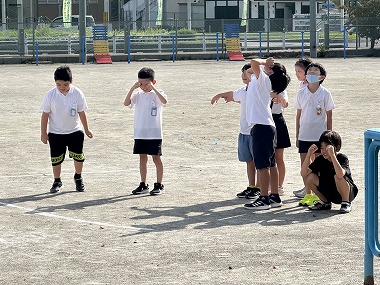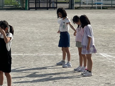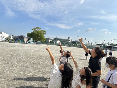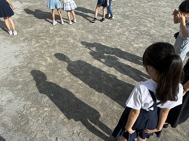 10数える間、影ぼうしを見つめてから空を見上げると、白い影がそっくり空にうつって見えるという遊びです。ずいぶんと涼しくなってきた5時間目、どの子も運動場で楽しみました。