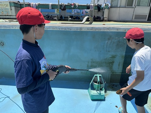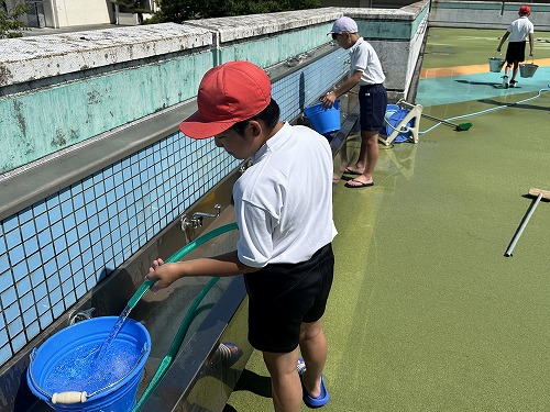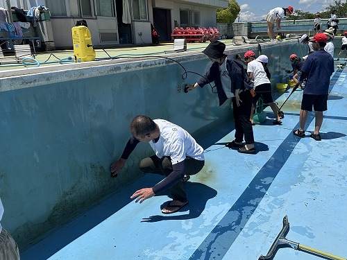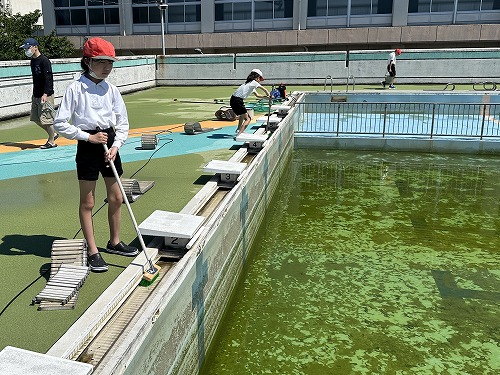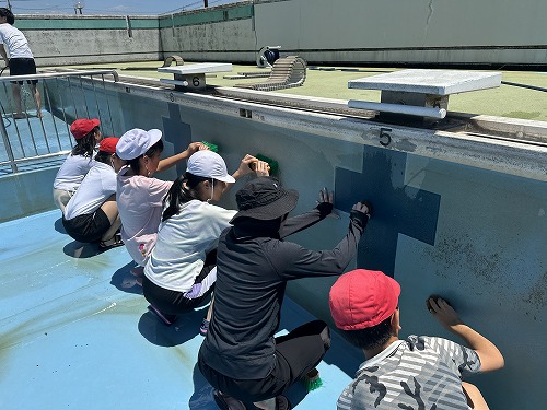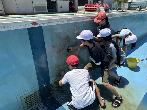 4年生・5年生がプールサイドや更衣室などを、6年生がプール本体を協力してきれいにしました。