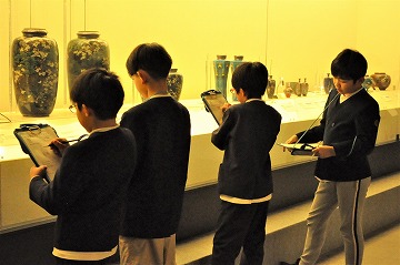 館内の見学では、大小さまざまな美しい作品に、子どもたちは目を輝かせながら、見たこと、聞いたことを記録していました。