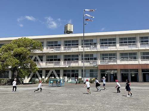 風を受けて元気に泳ぐこいのぼりを見ながら、子どもたちはドッジボールや鬼ごっこなど元気に運動しています。 子どもたちの健やかな成長を願っています。