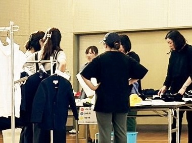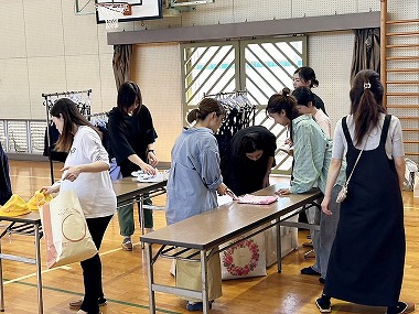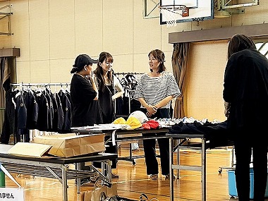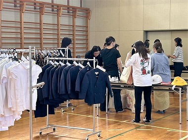 PTA役員・保健委員さんたちが、これまでにリサイクルに寄せられた本校標準服に値札をつけて並べ、この日は新入生の保護者を対象に、展示販売を行いました。