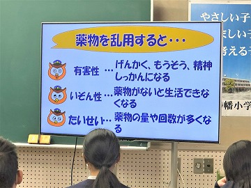 どの子も真剣に聞いていました。最後に、危険薬物のサンプルを見せていただき、断る勇気を確認していました。