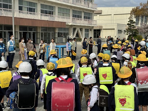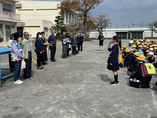 今日から1年生も上級生たちと一斉に下校します。5月の大型連休明けまで毎日5限後に一斉下校です。1年生の一斉下校開始に合わせて、「見守り隊の会」を行いました。登下校の安全を見守ってくださる方々に、下校前の運動場で、児童会長が代表して、日頃の感謝を伝えました。