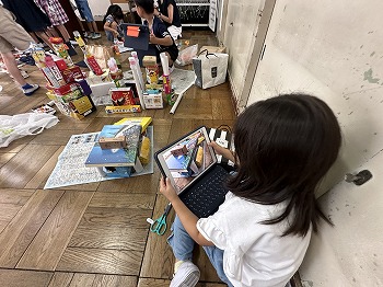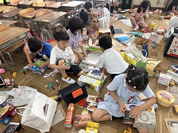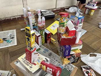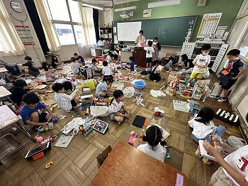1年生は図工で「いっぱい つかって なにしよう」に取り組みました。教室いっぱいに材料となる空き箱などを広げて思い思いに作品を作りました。またそのあと、みんなで鑑賞するために、それぞれが写真を撮って共有していました。