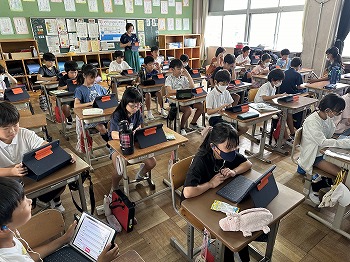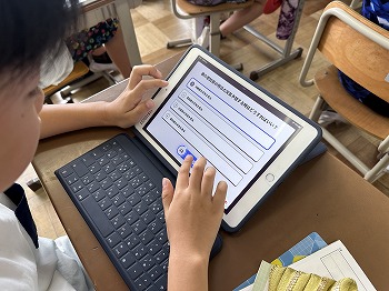 5年生は理科です。これまでの復習のためにそれぞれが理科問題を作成しました。今日はみんなで早押しクイズ形式でチャレンジしました。ICT機器ならではの学び方です。