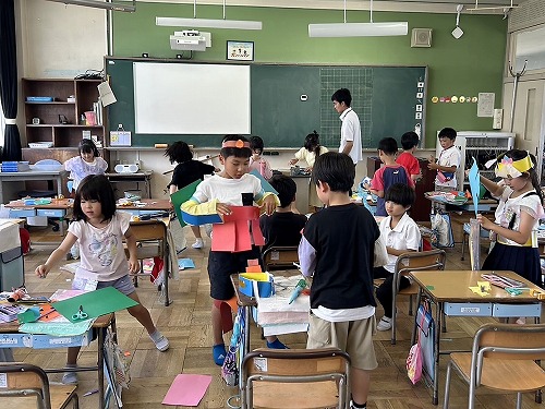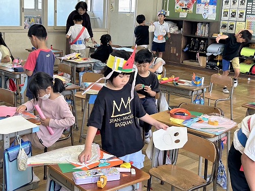 2年生が図画工作で「わっかで へんしん」に取り組みました。