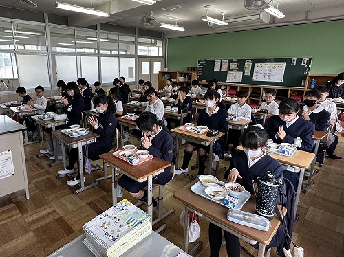 2年生から6年生は今日から給食が始まりました。今日は進級お祝いのお赤飯が出ました。写真の6年生は、配膳を終え元気よく「手を合わせてください、いただきます!」を言った後、お残し無しの完食でした。これからも、どの学年も、おいしく食べて元気に育ってほしいと願っています。