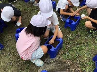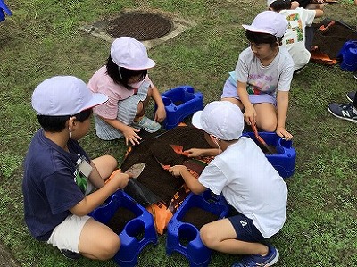 苗で植えた夏のミニトマトとは違い、子どもたちはラディッシュを種から育てます。それぞれの植木鉢に27粒の種子をまきました。発芽・成長が楽しみです。