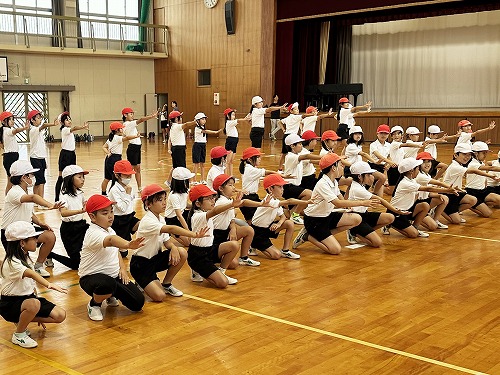 運動会の練習も進んでいますが、この日は雨あがりで運動場が使えなかったので体育館で行いました。3・4年生の表現運動の一場面です。どの子も楽しそうに、一生懸命に練習していました。