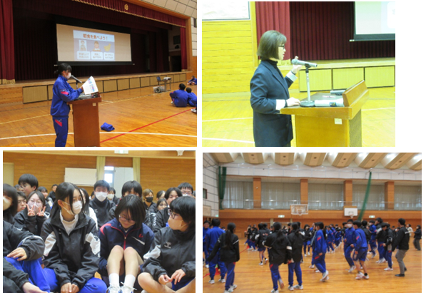 集会のテーマの通り、健康生活や心に関するアンケートに回答する前に、プランクやスクワット、もも上げ、エア縄跳びなどのミニ運動を行い、その後、回答用のコーンへ移動しました。少し体を動かしてから取り組むことで、生徒たちもリフレッシュした気持ちで参加することができました。