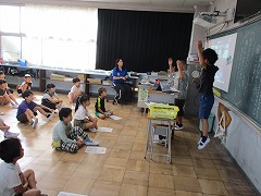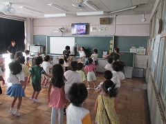 リーダーが各クラスに分かれ、中学校からもらった応援動画をもとに説明をし、みんなの前で実際に踊って見せます。新しい踊りにわくわくしながら動画やリーダーの手本を見る子もいます。応援の流れを知ったら、いよいよダンスの実践です!「右、左、くるくるくるくる!」リーダーのかけ声に合わせてクラス全体が踊ります。リーダーも次々と指示、説明を続け、次のステップへ進んでいきます。「お茶飲んできていいよ~!」休憩を取ることも忘れません。練習を重ね、この1時間で一通りの応援の形を各クラスに伝えることができました!明後日の準備は万全ですね♪