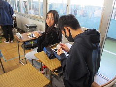 突然「訓練、地震がきました。」の放送が流されました。運動場で遊んでいた子や大縄跳びの練習をしていた子たちは、急いで運動場の中央に集まっていきます。職員室にいた先生たちも、事務机などの下に入って次の放送を待ち、まずは一時避難を終えました。