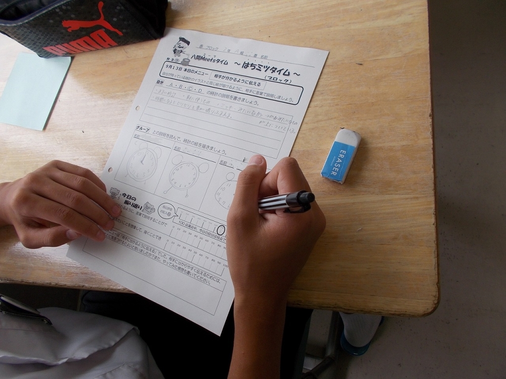 その後、今日は「はちミツタイム」を行いました。「相手に分かりやすく伝える」トレーニングです。先週から行われているブロック別道徳授業の仲間と行いました。4人1グループになって行いました。4人それぞれが異なる時計の絵をもち、それを文で説明を書いて回します。他の3人はその文を頼りに、イラストを描いていきます。あなたの思っていたことが伝わったでしょうか?これからダンスの練習、地域奉仕活動などブロックでの活動がたくさんあります。ダンスのフォーメーションや地域奉仕活動の清掃場所を伝える場面もあるでしょう。相手に分かりやすく伝えるにはどうすればよいでしょうか?