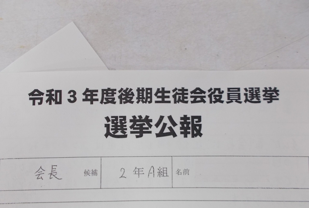 先週、生徒会役員選挙の立候補が締め切られ、27日からいよいよ選挙運動に入ります。投票は30日です。22日には各クラスに選挙公報が掲示されました。どの候補者も、自分が当選したら実行したいこと、八開中をよくするために取り組みたいことが書かれています。いよいよ八開中のリーダーが、3年生から2年生へ移ります。さまざまな面から八開中の今の様子を捉え、今まで先輩方が取り組んできたキャンペーン活動にこだわらず、生徒目線からのアイディアを出して、学校生活が楽しく充実したものになるような取り組みを期待します。新しいことを始めるにはいろいろな壁があると思いますが、執行部のメンバーで話し合って一つ一つ解決していきながら、新会長さんを中心に取り組んでいってください。投票するみなさんは、立候補者の気持ちを十分にくみ取り、投票に望んでほしいと思います。