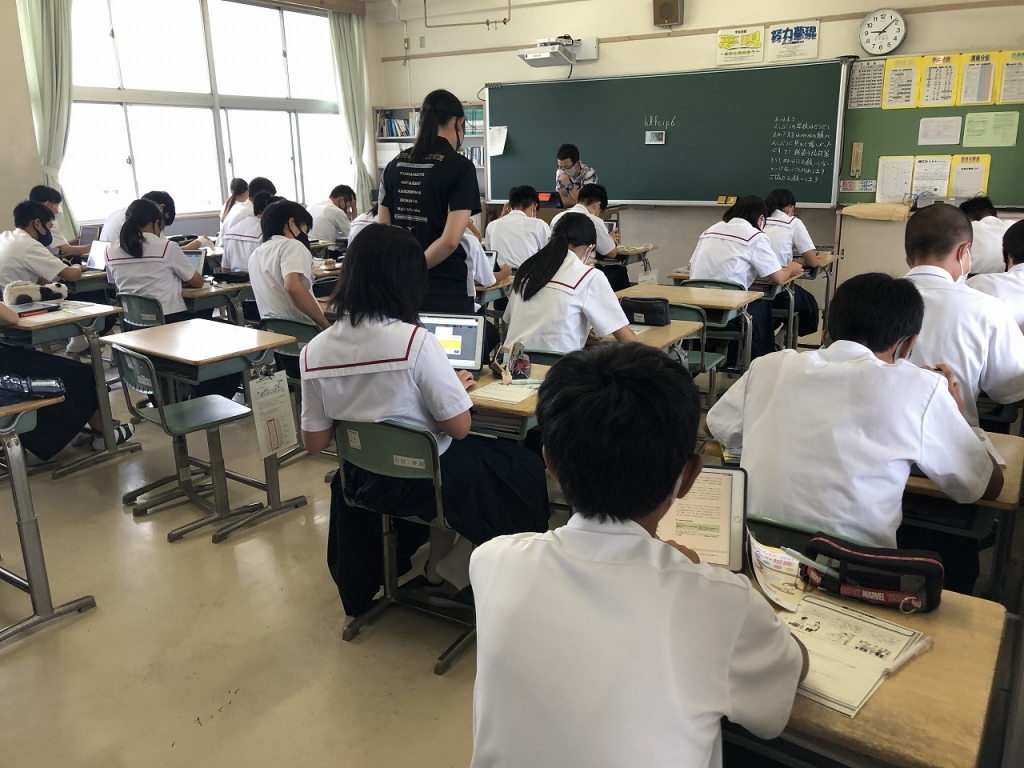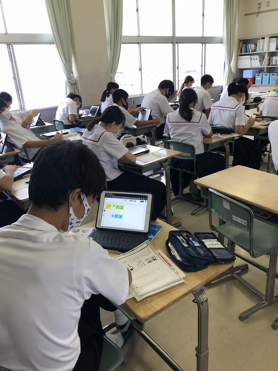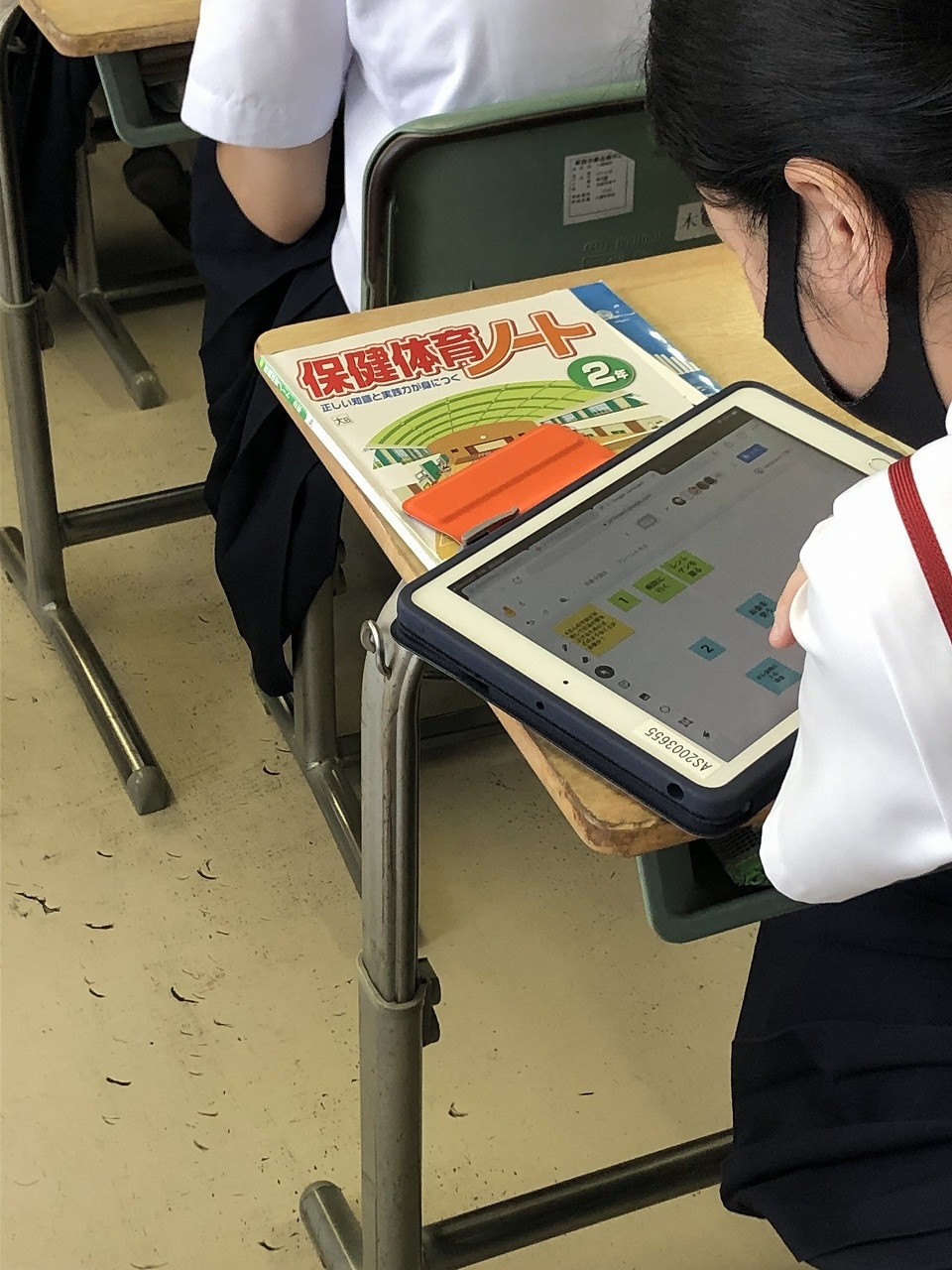一人一台タブレット端末が整備されて数か月経ちました。修学旅行や校外学習ではグループごとに写真を撮って活用しましたが、普段の授業の中でもさまざまな活用をしています。友達と意見交換をしたり、プレゼンテーションを作成したり、レポートを書いたりしています。保健体育の授業では、「Jamboard」というアプリを使って、クラスメイトと意見交換をしています。コロナ対策でなかなかグループ活動を思うように実施できない中でも意見交換できる方法です。