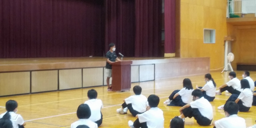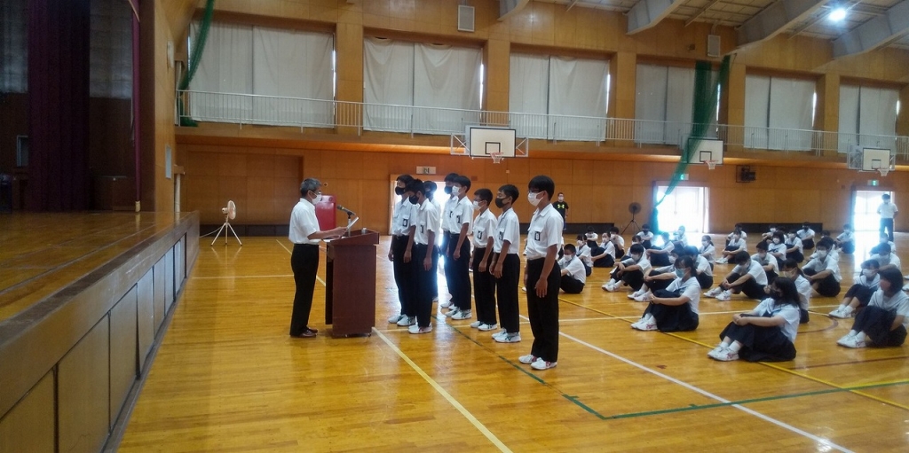 さて、長い休みがやってきます。本日は、体育館で朝礼を行いました。先日行われた「海部地区総合体育大会ソフトテニス男子の伝達表彰」「学校長の話」「愛西工科高校から寄贈された衝立の紹介」と続き、最後に「生徒指導からの話」です。昨年度に引き続き、今年度も新型コロナウイルス予防対策に気をつけなければなりませんし、最近、SNSやネット上のゲーム等でのトラブルも中学生の間で増えているようです。本日、「