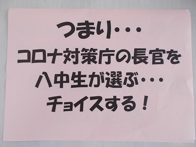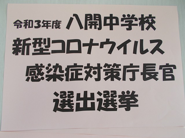 保健委員会の「感染症対策チーム」では、このたび、「新型コロナウイルス感染症対策庁長官選出選挙」を行うことになりました。保健委員会ではポスターを作り、本日の朝礼ではタブレットの「Zoom」を使って、保健室から選挙に関する生放送を行いました。初めての試みなので試行錯誤しながらですが、教室では選挙ポスターに対する「笑顔」が見られました。今後、後期生徒総会には全校で投票を行いたいと思います。