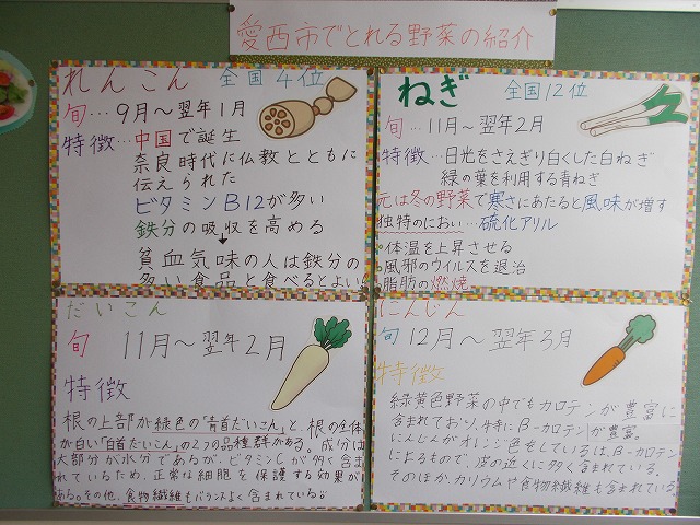 食育委員会の掲示板です。愛西市でとれる野菜の紹介です。れんこん・ねぎ・だいこん・にんじんです。れんこんの生産は全国第4位だそうです。愛知県は、